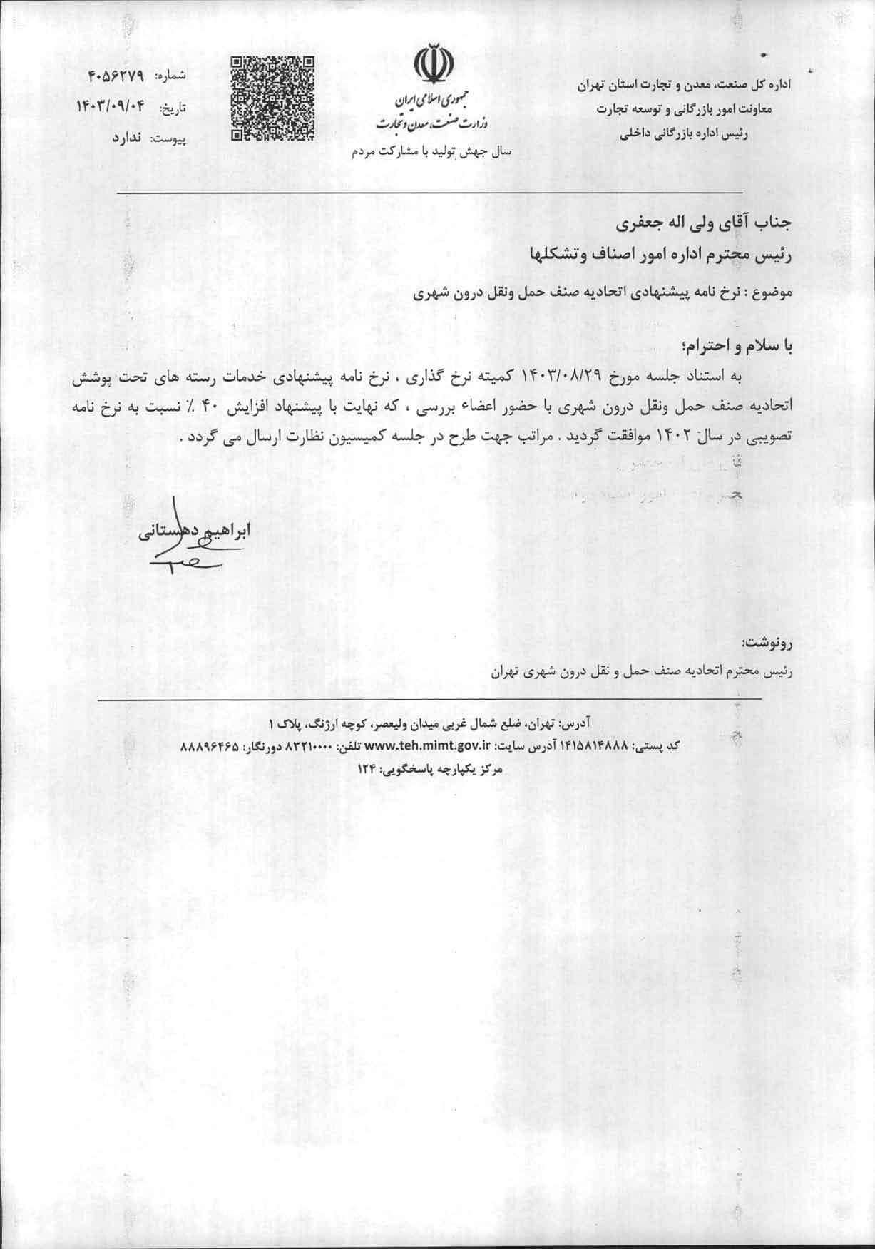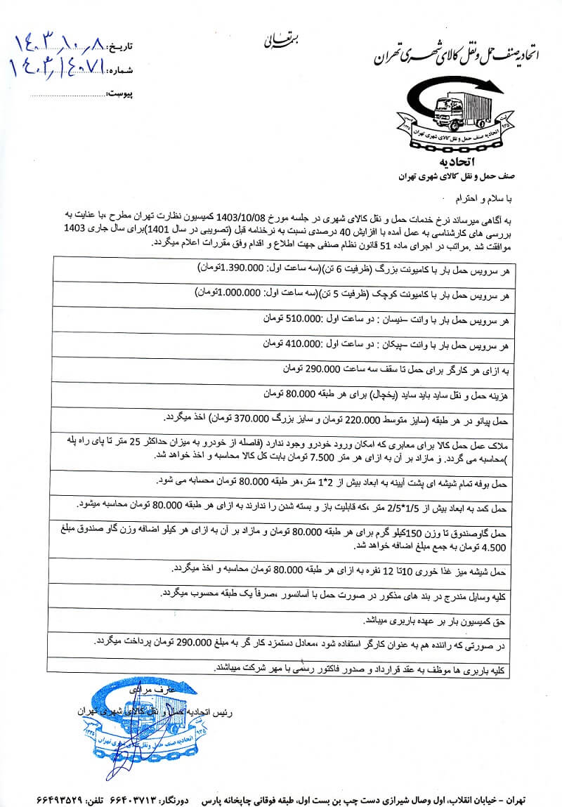 نرخ مصوب خدمات اتحادیه حمل کالای درون شهری تهران